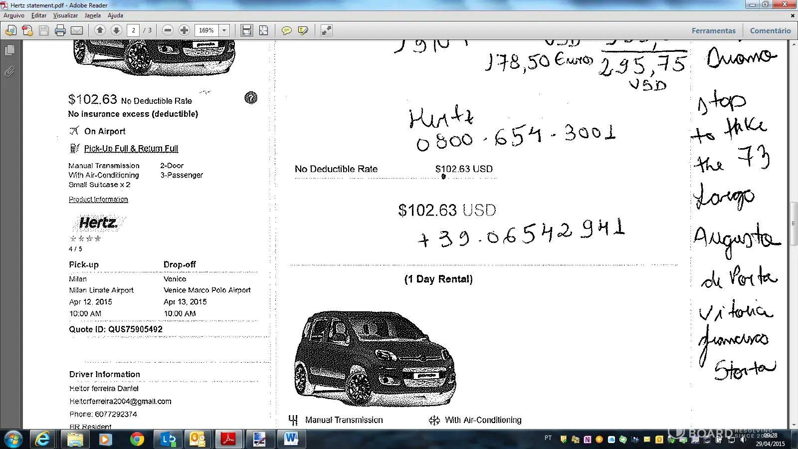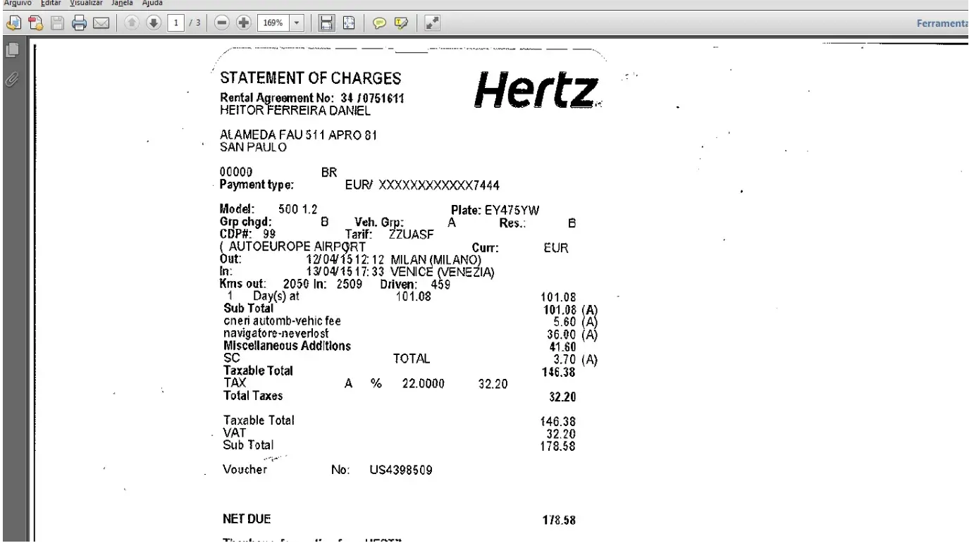 Srs. I rented a car manual transmission, 2 door, small and cheap car on March 19th 2015 and paid into my credit card 5491*****7444 the amount of USD 102, 63 for one day rental. I took the car in Milan Linate Airport at 12:12 on April 12th/2015 and delivered the car at Venice (Venezia) Marco Polo airport at 15:33 on April 13th. I am aware that I delivered the car some hours (maybe 3 hours more) after the time but they still charge me more EURO 178, 50 - USD: 193, 12. So, I am complaining about the total amount of charge USD 295, 75 for one day rent car small. I would like the refund of the EURO 178, 50.