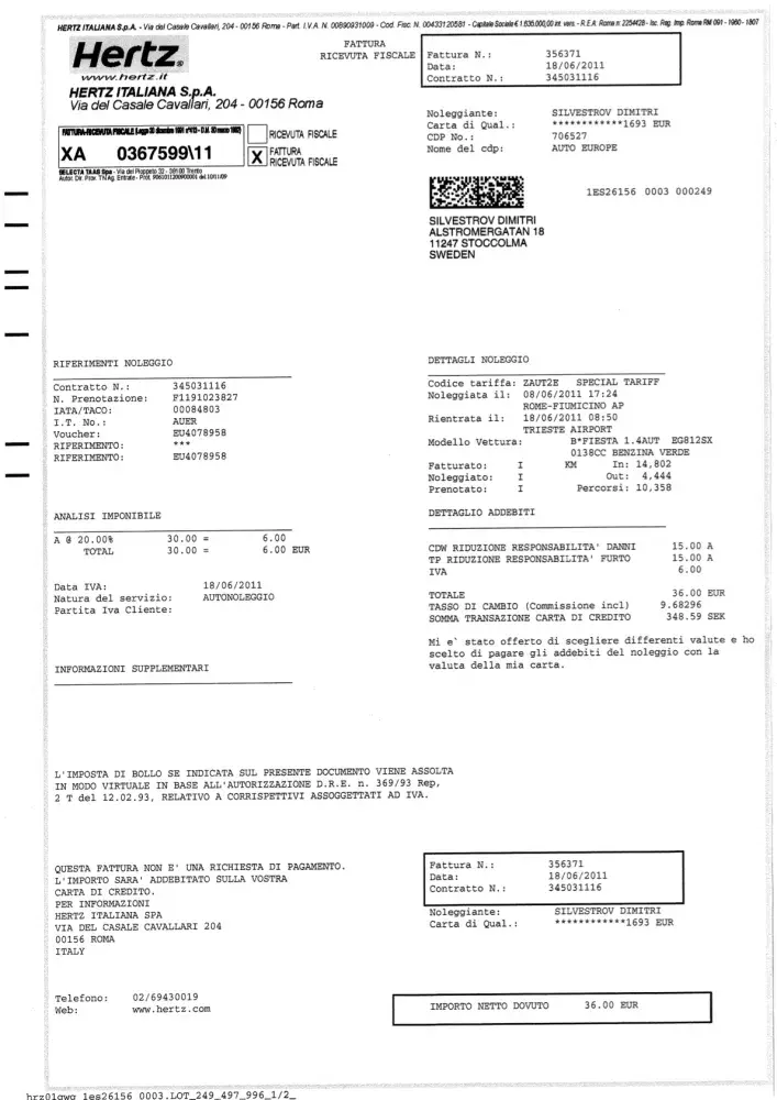 I attach the copies of the corresponding "Fattura" and the Print from the payments records of my Eurocard indicating this double charge.