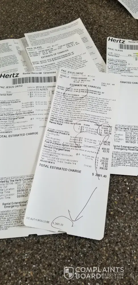 I was charged additional 'fees" that were not on my contract. They charged my VISA additional "hidden fees although my contract states all taxes and fees included . I have contacted Hertz but the customer service is awful. They claim the contract is an estimate and they have hidden fees they charge to your credit card after such as 'levies and taxes not listed'