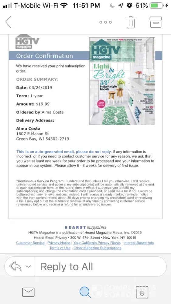 You have sent me an invoice for a magazine with account number [protected] for 19.99. I did not, not, not, not, not, not, not order anything from you. I never ordered a magazine from you. Do you do this to everyone who just puts in for the contest for home? I won't pay for what I did not order and do not send me anything. I always thought your company wa...