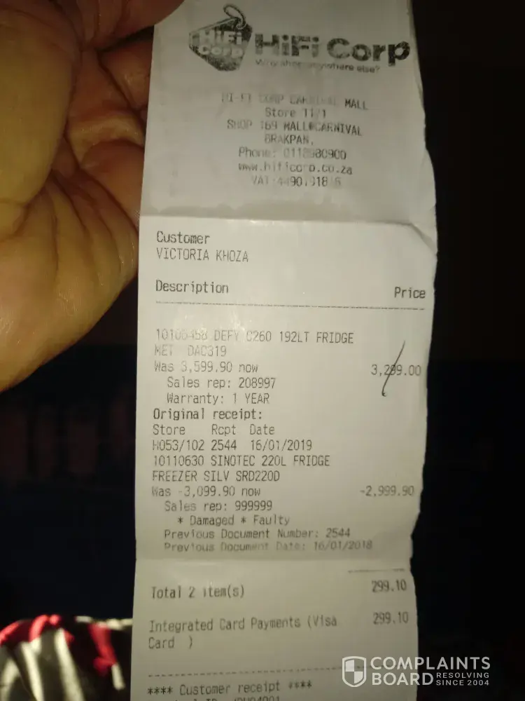 On the 24th November 2016, I bought a fridge from Hi Fi Corp, They had some sort of grand opening and they only had 30 or 50 of these fridges for R2999, I paid cash cause it was extremely busy that day so I did not want to be sent back due to cards being offline.