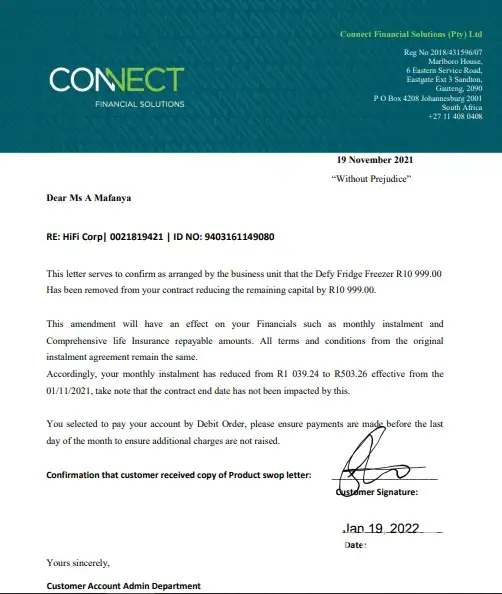 I took an account with Hifi corp for a fridge and washing machine, due to faulty reasons the fridge was taken back by the store due to it being faulty and they had no replacement for me. Then I asked them to restructure my account, they sent me a letter showing the new account structure, however, my credit score has not been amended accordingly and I have been receiving incorrect statements due to that I'm unable to make payment as I have no idea what is going on.