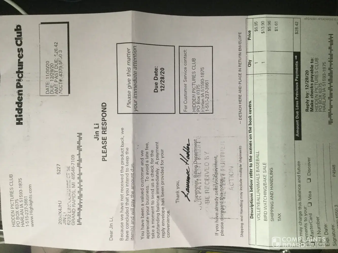 For the second time, we received a bill from hidden pictures club, claiming for the amount of $28.42 for items that we never bought or received. This is very annoying. Please stop sending this in our mail.