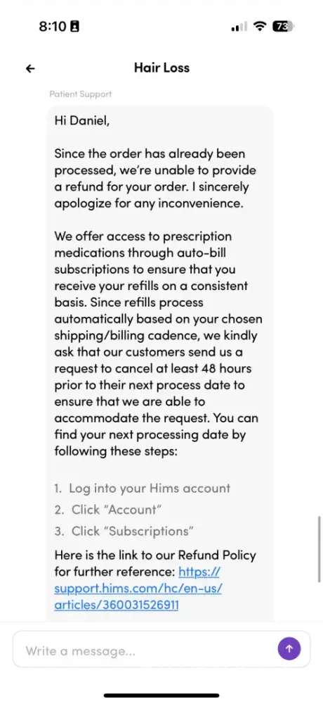I subscribed to a product with Hims earlier this year. I did not want to continue the subscription, so I reached out in July to have the subscription canceled. Today, a charge was placed on a card. I did not receive any notification that a charge was coming, and I thought the subscription had been cancelled months ago. When I reached out to customer service, they told me they were unable to refund me, but could issue a replacement. Any company that claims they cant issue refunds is lying.