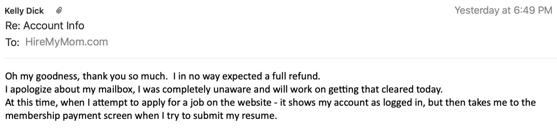 I had a really bad experience with Hire My Mom. I talked to a lady once and spent a whole weekend getting everything ready for her. I made a video and wrote out instructions in an email. She wanted me to pay her before she started working, which I thought was weird, but I did it anyway. After that, I never heard from her again. I tried calling to complain, but no one helped me. I really hate this group and I don't think anyone should use them. I paid $65 an hour and she didn't do any work at all. She just took my money and laughed about it.