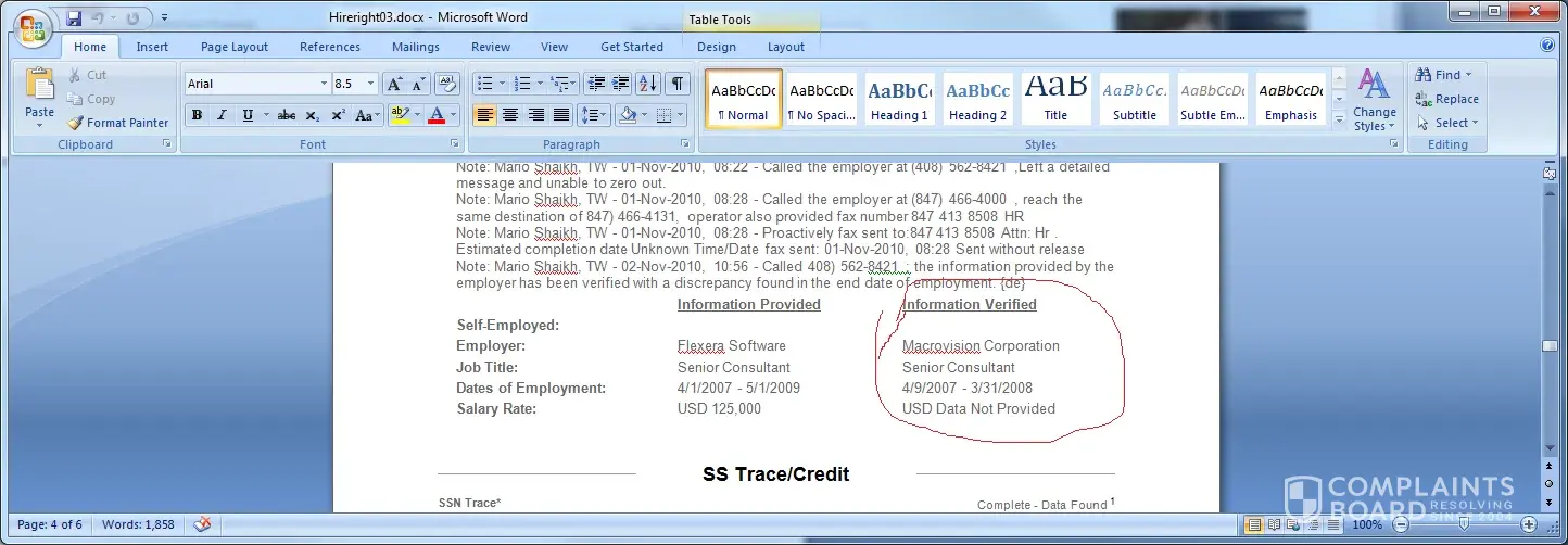 HireRight said I lied about the dates of Employment on a Job. They gave me a short time to disprove this by faxing in 5 year old Tax returns I didn't have when I was out of town on Business. I was given 48 hours to do this.