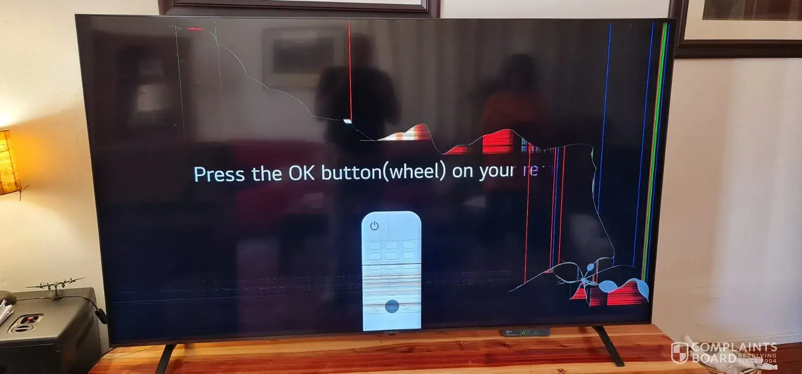 Desired outcome: WE WANT LG/HIRSCH TO REPLACE THE TV AS THEY/THIER EMPLOYEES WERE/ARE RESPONSIBLE FOR THE DAMAGE SUSTAINED TO THE TV.