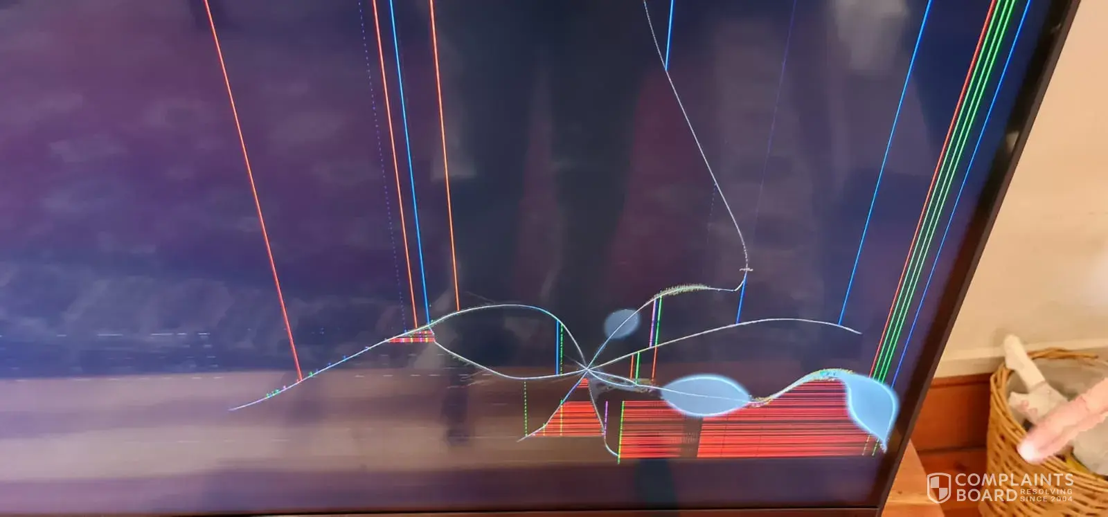 The TV screen then lit and appeared to be working correctly with no cracks etc visible. Delivery guy insisted in taking phots of same. The TV was immediately switched off, the delivery person took out the mains plug, and draped over the top of the TV. The delivery men then repacked the TV, i.e. placed the polystyrene packing back on the top of the TV, and then slid the outer cover box back over the TV, pushing it down hard over the base plinth.