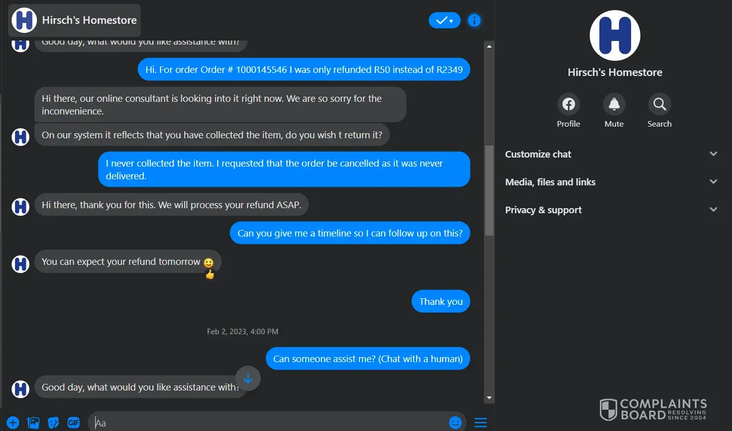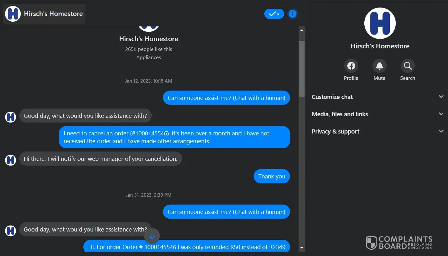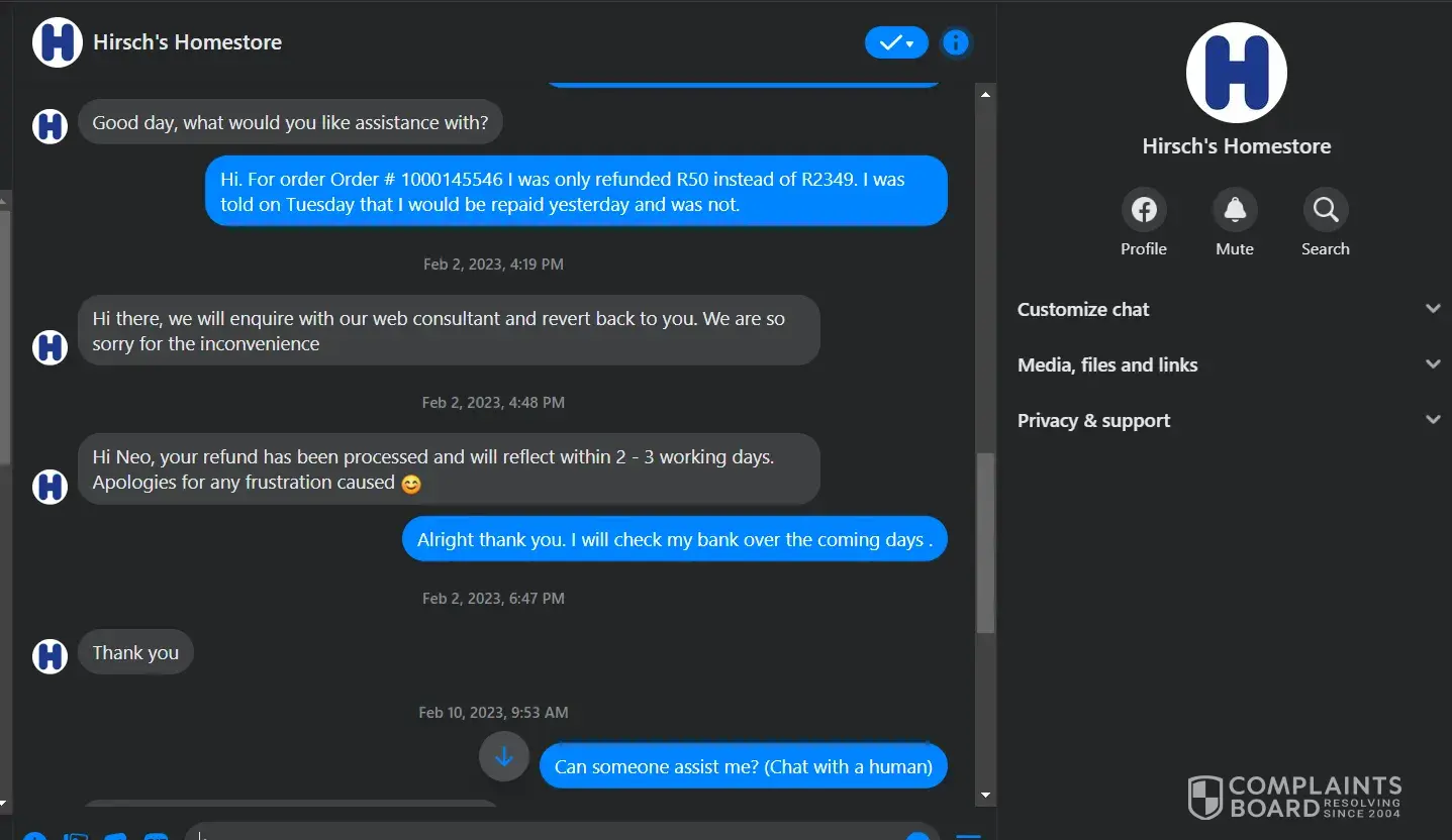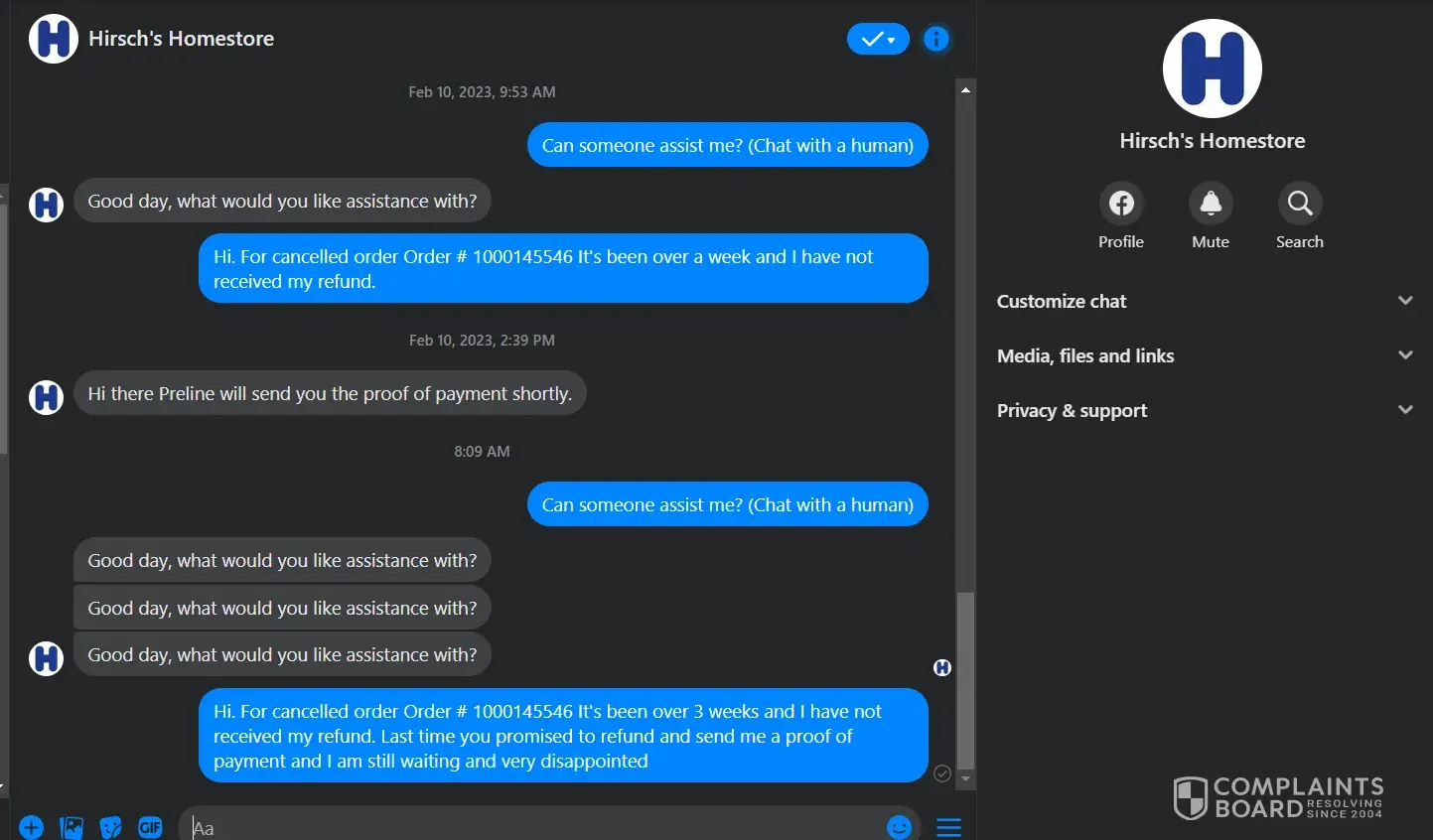 - While Hirsch's has a high level of trust, our investigation has revealed that the company's complaint resolution process is inadequate and ineffective. As a result, only 3% of 65 complaints are resolved. The support team may have poor customer service skills, lack of training, or not be well-equipped to handle customer complaints.