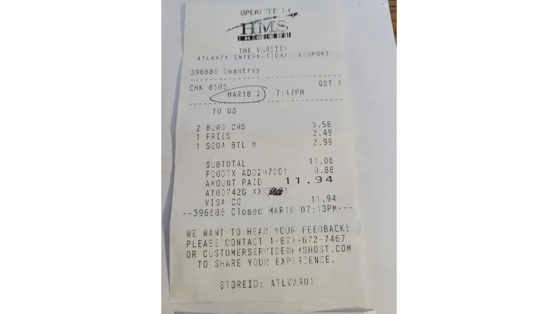 I arrived at Hartsfield airport just before 7 PM on Friday, March 18. No food was served on the flight so I planned to eat in the airport before catching my next flight. I went to The Varsity as I had eaten at a Varsity restaurant before in Athens, GA and liked the food and assumed this was an offshoot of that restaurant.