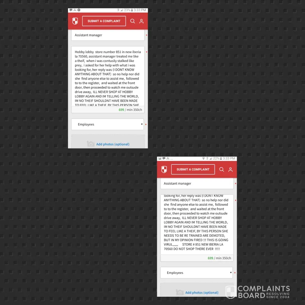 Hobby lobby store number 851 in new iberia la 70560, assistant manager treated me like a theif, when i was contusily stalked like prey, i asked for her help with what i was looking for, her reply was (I DONT KNOW ANYTHING ABOUT THAT) so no help nor did she find anyone else to assist me, followed to to the register, and waited at the front door, then proceeded to watch me outsude drive away, ILL NEVER SHOP AT HOBBY LOBBY AGAIN AND IM TELLING THE WORLD, IM NO THEIF SHOULDNT HAVE BEEN MADE TO FEEL LIKE A THEIF, BY THIS PERSON SHE NEEDS TO BE RE TRAINED ARE DEMOTED, BUT IN MY OPINION FIRED ! THIS IS GOING VIRUL, , , , , , STORE # 851 NEW IBERIA LA 70560 DO NOT SHOP THERE EVER !