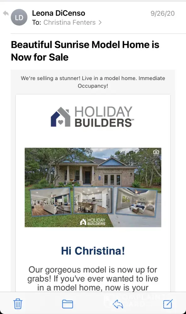 â—There were at least 19 different people during this whole experience who were contacting me. Never just ONE single person from Holiday Builders to deal with. My realtor was originally on the emails so she was informed what was going on, then they removed my realtor from the emails so she wasn’t aware of everything that they were doing to us.