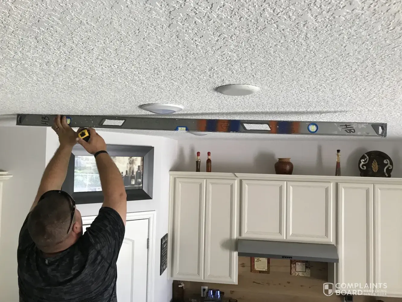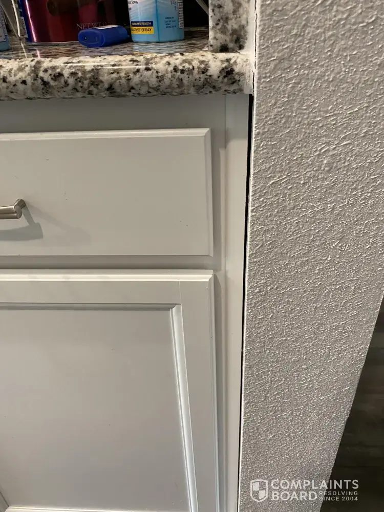 We have been waiting 3 months for him to return so we can also address the gap between the wall and the cabinets. I don't think after we have lived in this house long enough for it to start settling.