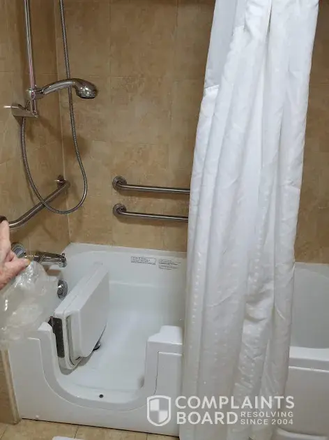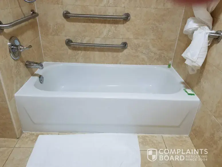 4) I tried the tub. Water was quickly ankle deep; the surface was slippery for a healthy person. I wasn't going to let my mother use this tub and went to find the manager. The desk clerk told me we were not in a handicap access room after all. Before I left, the drain took 7 1/2 minutes to clear the tub after my 5-minute shower.