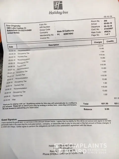 Holiday Inn unauthorized fees added to our hotel bill