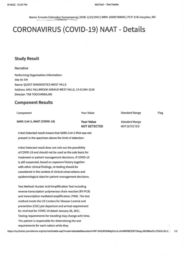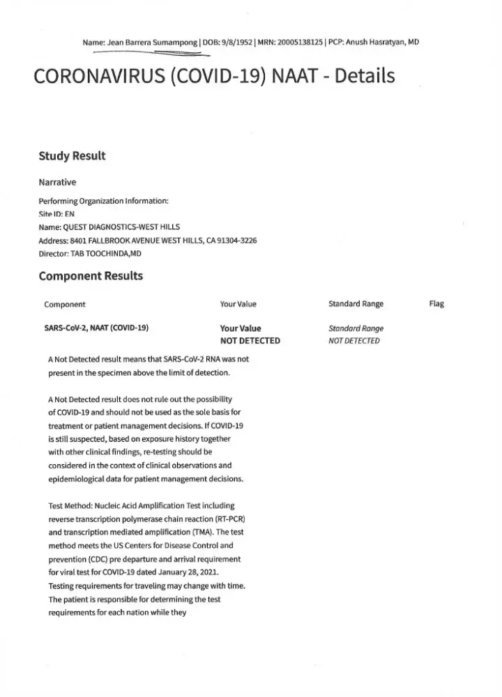 I'm Jean Sumampong. My email address is [protected]@hotmail.com.phone and my phone number is [protected]. We were on the cruise with my husband Ernest Sumampong last July 6, 2022 for 10 days on the Jewel of Scandinavian. We had a Covid test done on July 3,2022 done at a local clinic. I called Holland America cruise line that I don't have the result of the Covid test for were leaving on the 4th of July because I don't want to be delayed on my cruise. Per say the man who answered the phone said "as long that I have a letter from health personnel where the test was done it's okay. We will have a complementary test for Covid to be done on the ship before