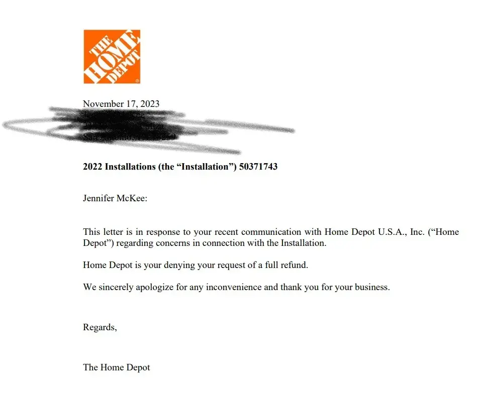 Do not do laminate cabinet "reface" or any service from Home Depot Home Services. My job was done so poorly it had to be redone several times. I am still unhappy. I asked for a refund for the reface and was sent a form letter signed "The Home Depot." An actual person could not sign the denial. See pic.
