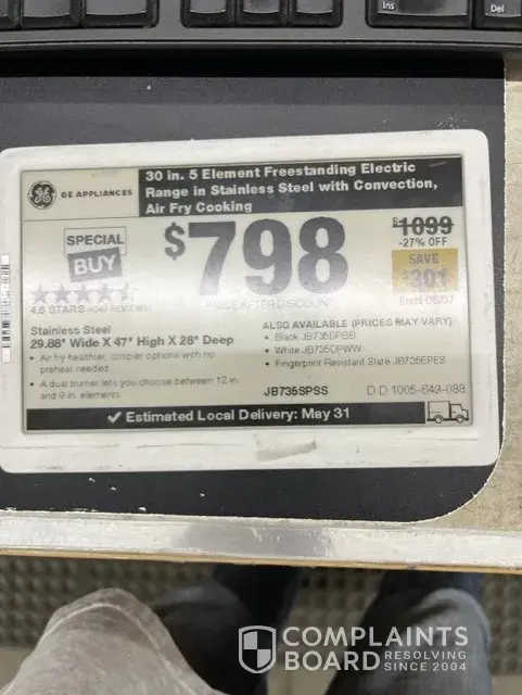 Desired outcome: We would like the GE Range at the advertised price of $659.40, which is 40% off $1099.00. Contact me: Jani Haffeman, [protected] or email: [protected]@hotmail.com