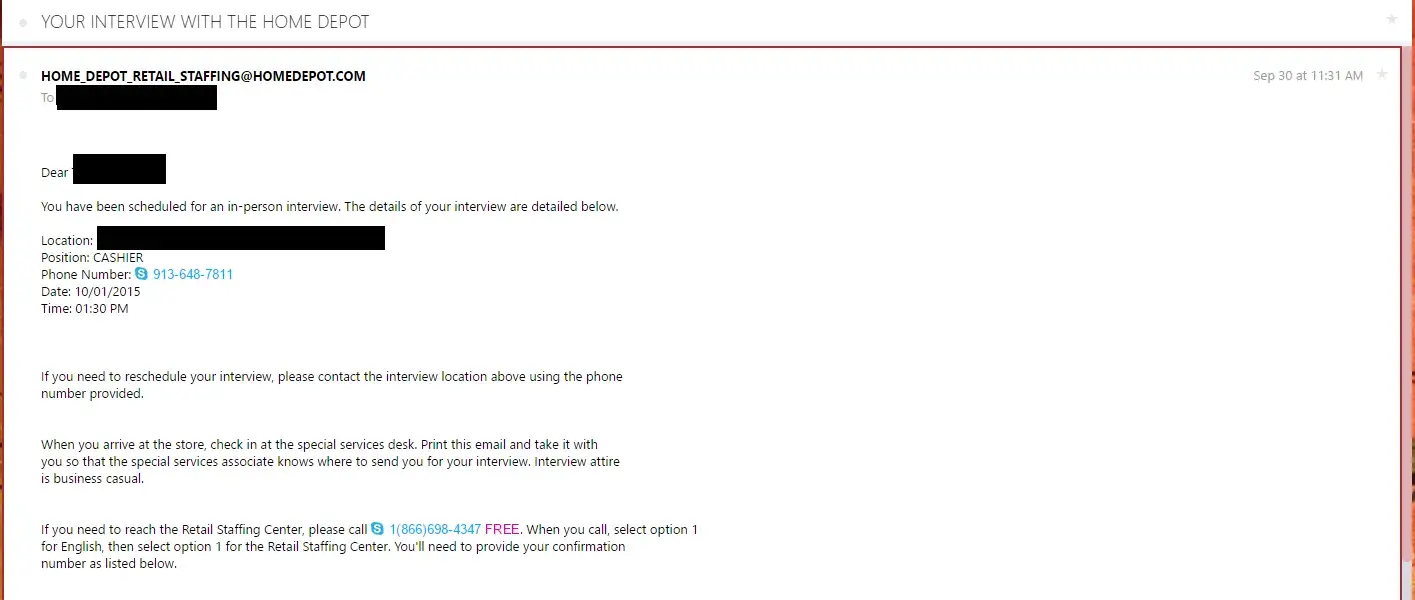This occurred on 10/01/2015 at 1:30 pm I submitted an application to work at home depot and was selected for an interview. Got an email confirming my interview date and time as stated above and showed up 10 minutes early. Reported to the appropriate desk, a manager was contact, I was told to go to "the training room". I waited in the training room for about...