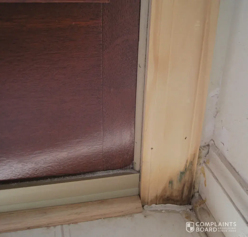 After the doors were fixed, and in between the hospital visits, we contacted Home Depot for compensation. A local assessor came out and insisted that was wind damage, which she claims for which HD is not responsible. We tried to explain that the screws to secure the doors were too short (1/2 instead of 3 as required) and there were only two nails to support the bottom part of the door instead of six. Accordingly, the door became tilted and was not locked properly. In addition, the door frames were not caulked at all to seal the openings between the outside wall and the door frames.