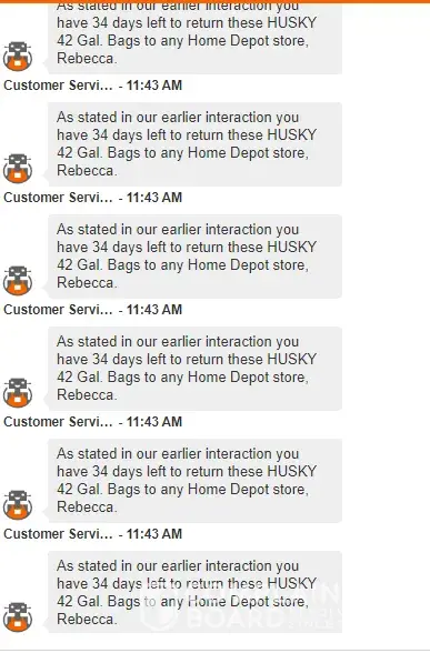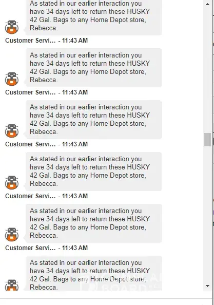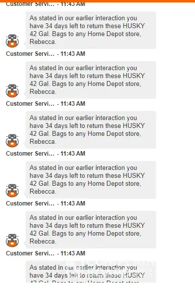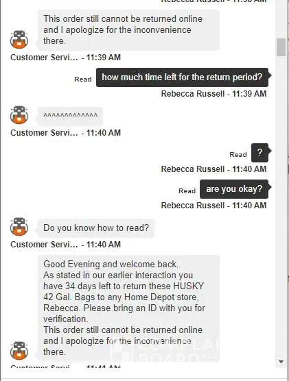 I have chatted with a rep from Home Depot and I was not able to see the # of days showing on his reply so i asked again if how much time left for the return period however he sent me a character ^^^^^^ and ask me if i know how to read. THIS IS RIDICULOUS! He did not stop there. He sent me the same messages 30 times! Home depot, pls do quality assurance with your rude agents. I'm spending a lot in your platform, and this is what I get?