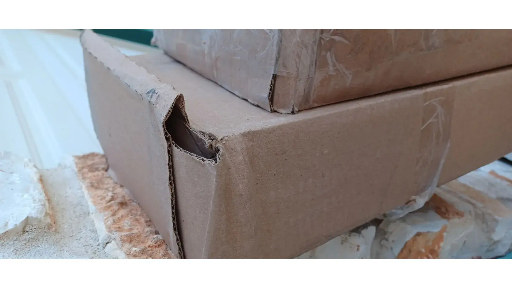We had to purchase additional flooring to replace some of the original order that had damaged pieces. It was a week late just like the original order causing delays for the contractors. This is what the two boxes looked like when I opened them. They left it outside the garage at 630 AM and signed for me and I can see why. It appears that they threw or just dropped the boxes on their ends. One whole box, with the plastic wrap torn open is useless.
