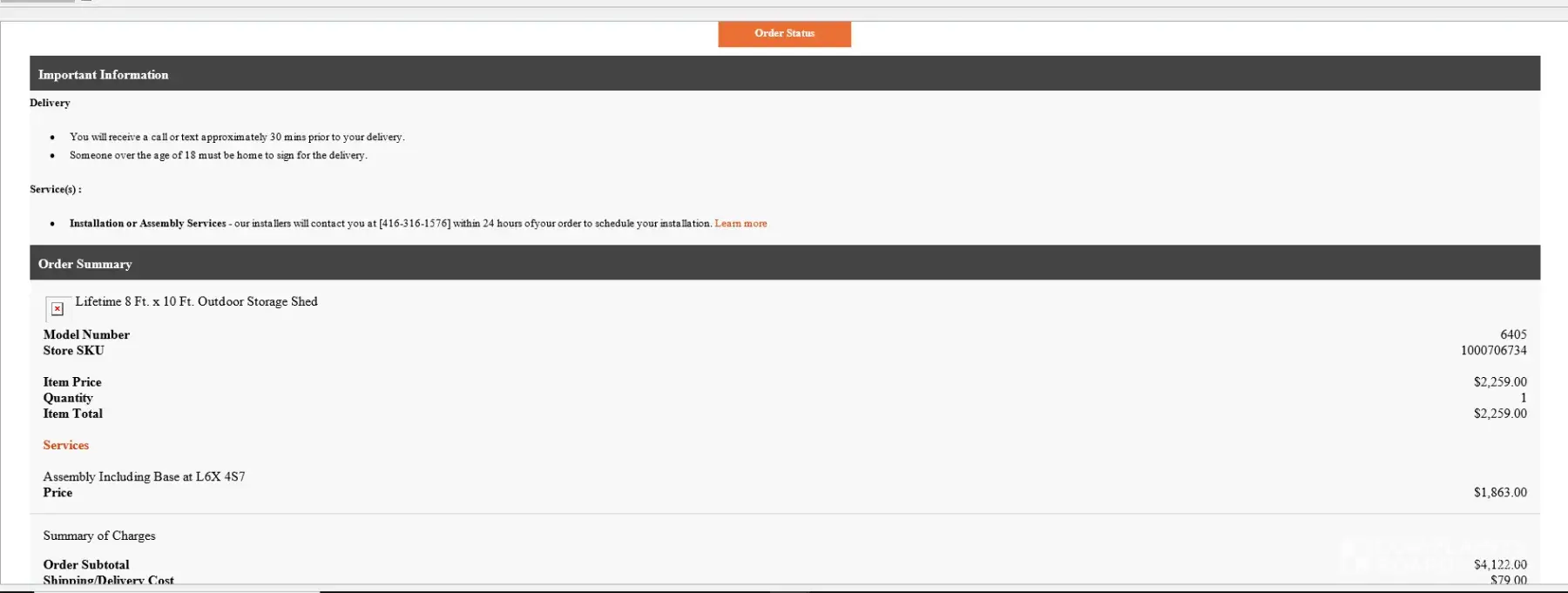 We did call home depot on Friday 17 June evening and till today 21 June, no installer or contractor has called us to assemble the base and the shed. Also when I call agents, they keep asking me if I paid for the installation of the base and shed. I keep saying yes for both.
