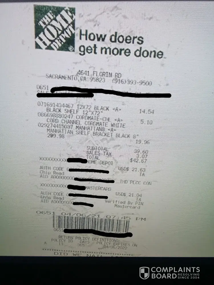 Purchased 4 items online through home depot on May 2, 2021. Received a email stating a delivery was coming and seen it was a old address from 12 years ago. I tried contacting them multiple times on the phone with no luck. I then used the text service and told whoever the situation and was told we can make minor changes but not a different address. I also should add I purchased a different item through home depot online 2 weeks before this order and no problems, they sent it to the correct address. I didn't do anything different and didn't type a address from 12 years ago. I was able to then contact UPS for the one item and had that shipment sent to warehouse for pick up and I'm not sure if I'll be able to pick up because hours are between 3-5pm only, work comes first. The next 2 items arrived over 4 days later to my old address a hour away, tried contacting fed ex the same day home depot blew me off and was told only shipper can make changes to order. The last item just shipped the day after contacting home depot and yes they sent it to old address. They obviously could care less about customers. I then contacted paypal mastercard and paypal decided to swiftly side with home depot because they had a tracking number saying the items were delivered. I now will no longer use paypal or home depot. It sucks and it's been a real pain with the added stress. I have health issues and now I'll have to take them to small claims court for 350.00 dollars.