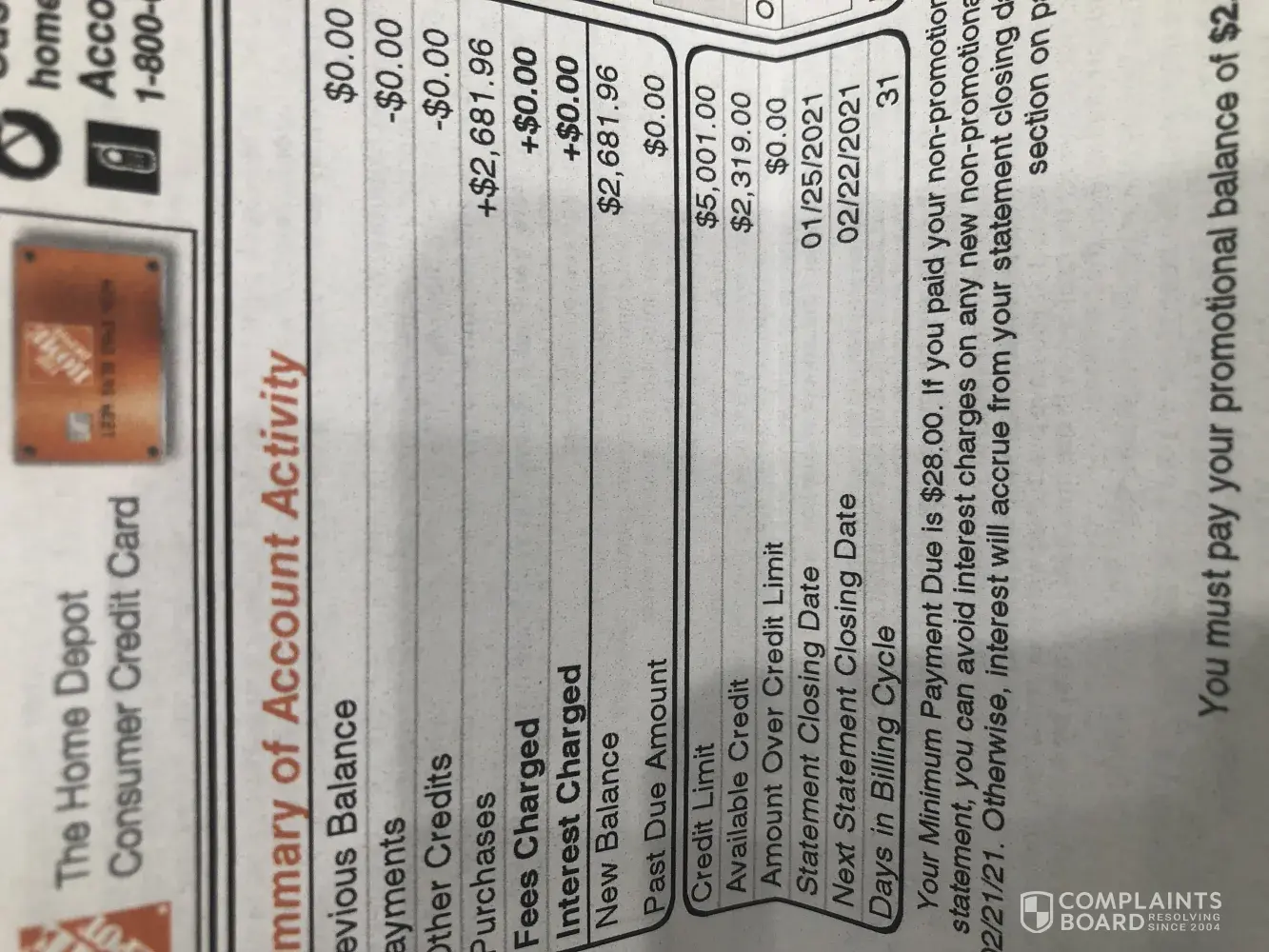 We mailed our check on 12-26-20, on 01-11-21 we received a late notice with a $30.00 fee. Bank indicated check had not cleared, lost in mail, many complaints to bank. Called to resolve and was told "pay entire bill" put that amount on bank ATM Debit Card, would not remove fee. Cancelled card and shredded it. We have spent thousands with HD over the last few...