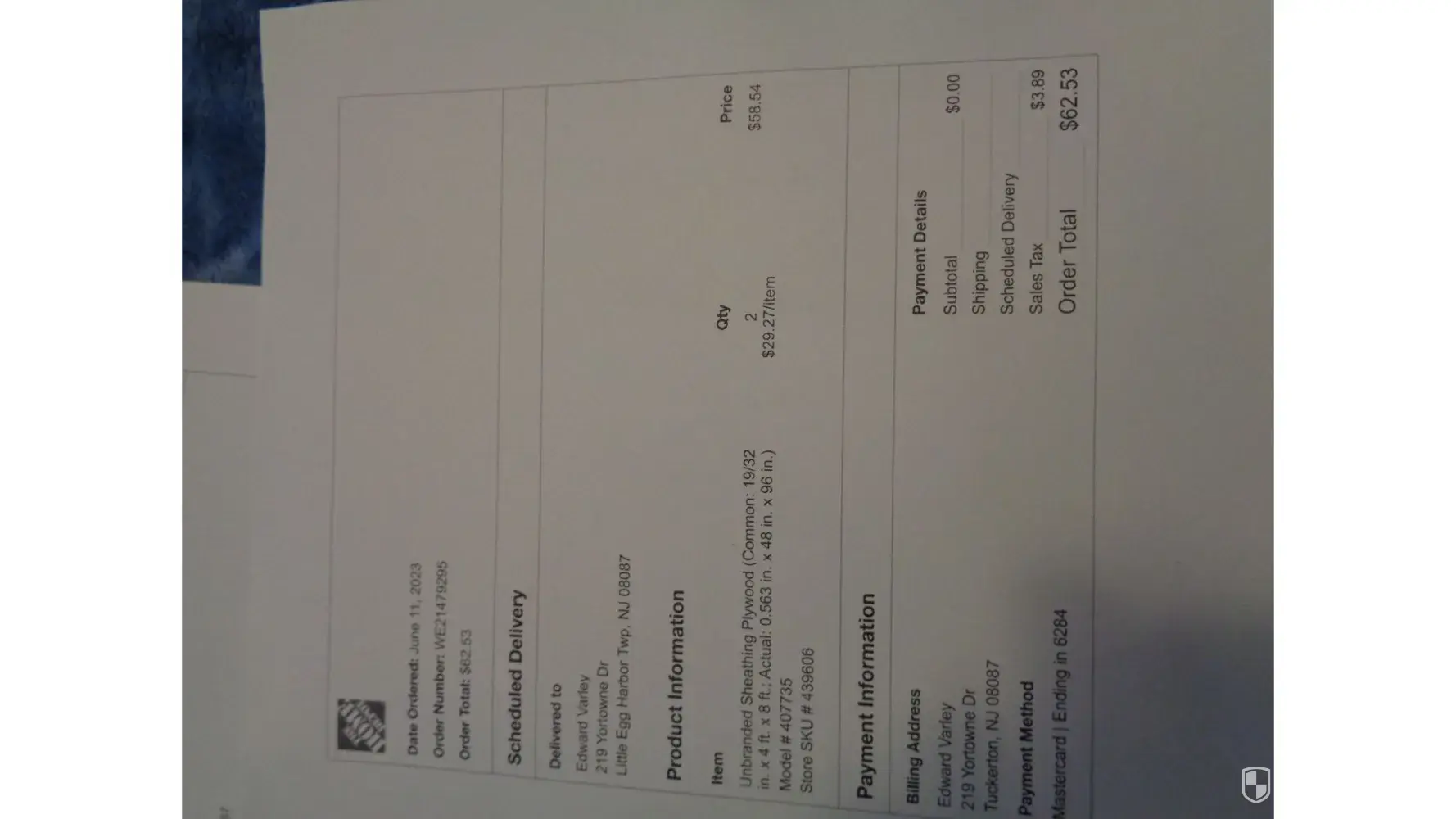 On Sunday June 11th I hade went online to order 2 sheets of plywood that I needed for underlay for my bed. This was The Manahawkin store that I had always used and never had any issues with. I had ordered 2 sheets of plywood at the cost of $29.27 each, Price $58.54, Plus 79.00 to have it delivered to my address at 219 Yorktown Dr. in Little Egg Harbor TWP N.J.. Plus tax of $9.11. I paid with my credit card and got a delivery date for Monday the 12th 8:00 am to 8:00 pm. for yard delivery. I had kept looking out front until 8:30 and no delivery. So I figured something went wrong. I checked my cell phone and had a message from the delivery man stating he ran late so the delivery may come tomorrow or later in the week. The next day Tuesday June 13th I had called the Manahawkin office and Explained that I had not received my delivery but on the tracking online said it was delivered at 8:22 and when I checked the status it said it was delivered 7:02 pm. He said he would talk to his boss and get back to me. My fiance and I had doctors appointments and got back home to call and find out why nothing had come or a phone call, My fiance called and found out that the delivery was coming from Forked River not Manahawkin and was told that I had picked the wood up there. He was told that wasn't possible and that I have a car and no way of transporting two sheets of plywood. He told her he checked with his girls and said that they said I did. I got on with him and told him if that was the case why would I have paid the $79.00 for the delivery if I was to pick it up. He said well I will refund you the 79 but I wasn't getting the money for the wood till he checked his cameras. First of all who gave someone the wood without getting ID. and why do I get charged? I and out 62.58 and this jerk paul should be fired as well as the ladies who lied and said I picked up my own wood. I have never been to that store in my life and if they can give an accurate description of me I'll be a monkey's uncle. So I still didn't get what I wanted, accused of being a thief and a crook like you people are. Thanks for nothing