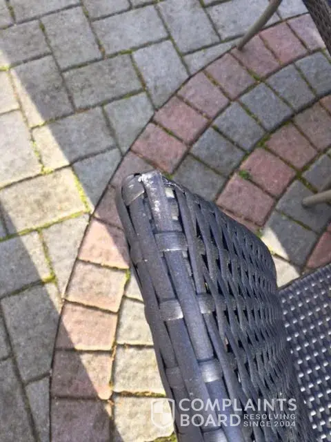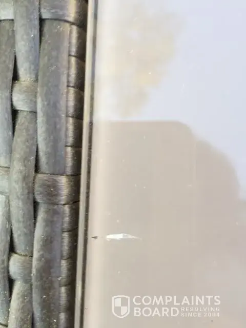 The table had a piece of film missing and they put a piece of tape over it but it should have been exchanged for a new table top. We purchased it new and it came in like a second hand piece. Home Depot's solution was to send us paint to fix the problem. Two of the chairs had damage on them and again the solution was to send paint.