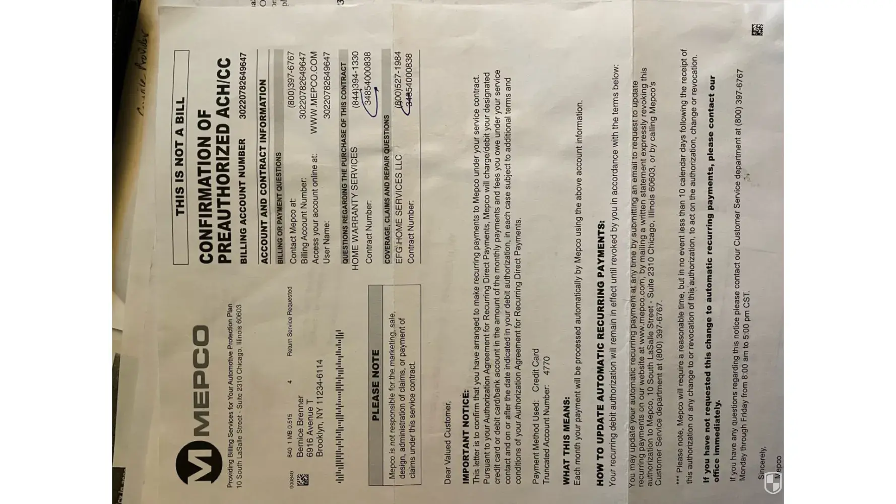 After my 96 year-old mother (Bernice Brenner) passed away on 10/17/23 I have been going through her finances and canceling her credit cards. I contacted Sears today that she had a MasterCard through and discovered that she has been paying this company since June for a warranty on (possibly?) an automobile disposed of many years ago. A company called Mepco out of Chicago, IL facilitates their payments and she has been paying 234.22 per month. As I canceled the credit card today, no additional automatic debit payments will be issued but I am trying to get her money back for fraudulent services. Her contract number is: [protected] and the phone numbers that are listed for the company are: [protected] and [protected].