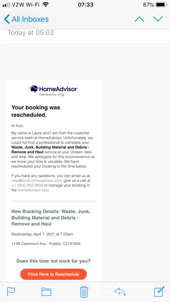 I placed a request for junk removal a WEEK prior to the day requested. I made the request on April 1st. The day that was scheduled and CONFIRMED for MONDAY April 5th at 7 am... The day of I get an email and text, literally minutes before the "CONFIRMED CONTRACTOR" was supposed to show up, saying "Unfortunately, we could not find a professional to complete your Waste, Junk, Building Material and Debris - Remove and Haul service at your chosen date and time". The booking was CONFIRMED! Meaning that there IS A CONTRACTOR AT THE READY! They made FALSE CLAIMS and I have a reasonable expectation to have my prepaid appointment met without exception! To suggest that after 5 days there wasn't an actual person to begin with after TWO confirmation emails and then literally minutes before, there actually wasn't anyone from the start. Then there's the happy Guarantee ... we'll I'm NOT HAPPY and as advertised requires that HomeAdvisor complete the requirements of the job at THEIR COST!