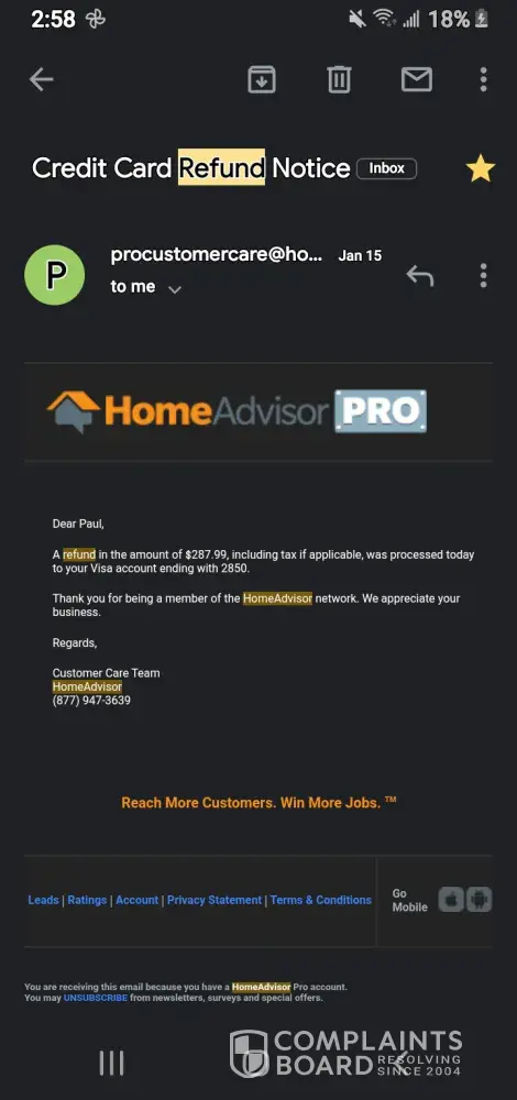 As a contractor I was promised a lot of things but in the end home advisors ended up cashing in 1, 027 after the team had spoken with them about the almost 5k bill from them. The point of contact didn't walk us through anything and I would advise other contractors to avoid ha they send you a bunch of robo contacts just to charge you. Then I found this on a search about homedvisors being a scam.
