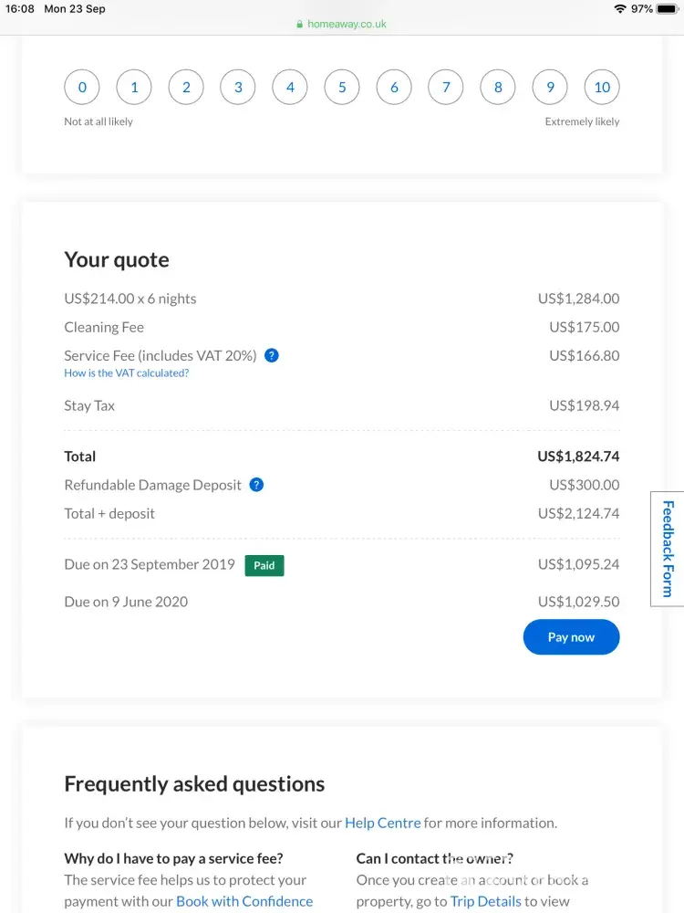 NEVER AGAIN WILL I DO BUSINESS WITH HOMEAWAY. This is an arrogant nasty outfit which should be banned from doing business. Their website is setup in such a way that customers get angry and confused. Cancelling a deposit appears virtually impossible.