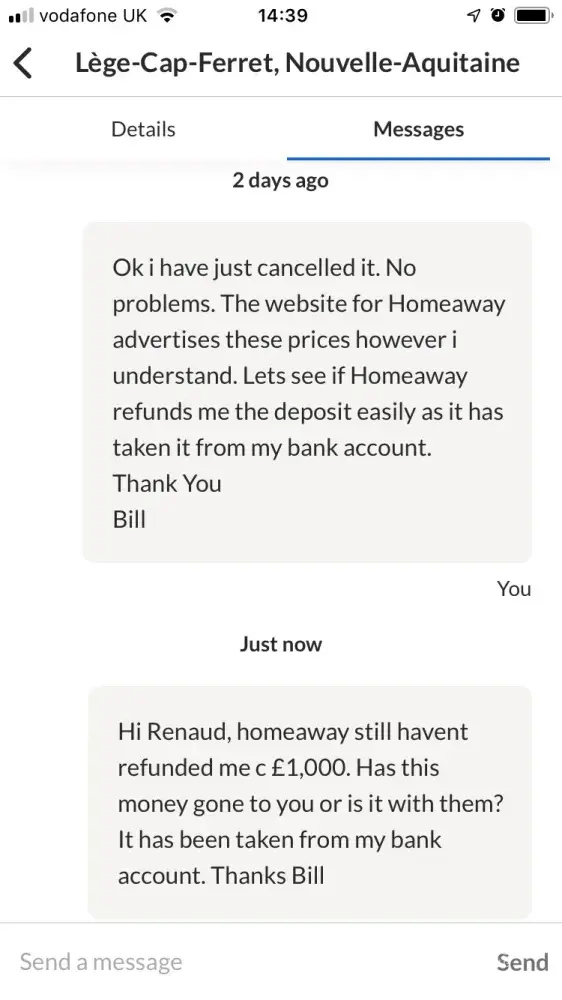 ...last weekend (12/5/2019) and was debited £1, 082 from my bank account on 14/15/2019 automatically but was asked by the Owner to cancel my booking (see attached photo) with them saying that the prices for that week were not as advertised on Homeaway. I did this immediately but I have still not been refunded the money taken from my account.
