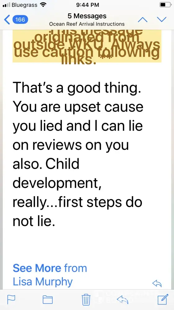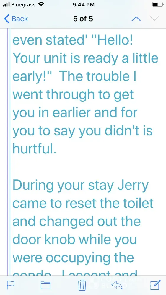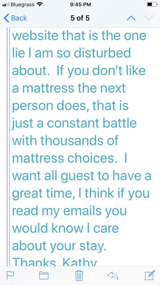 After writing a review that was not completely positive, although I did give 3 stars, I received the following negative emails & even a threat to write negative things about myself. The emails were from Kathy. I called & left several messages but never spoke to anyone while there. I did receive a couple of missed calls but no messages were left regarding issues. This property manager should be reprimanded or taken off the site. I have no problems with homeaway itself & will continue to use this site but I will make sure I talk with owner personally before trip. Please respond to email below.