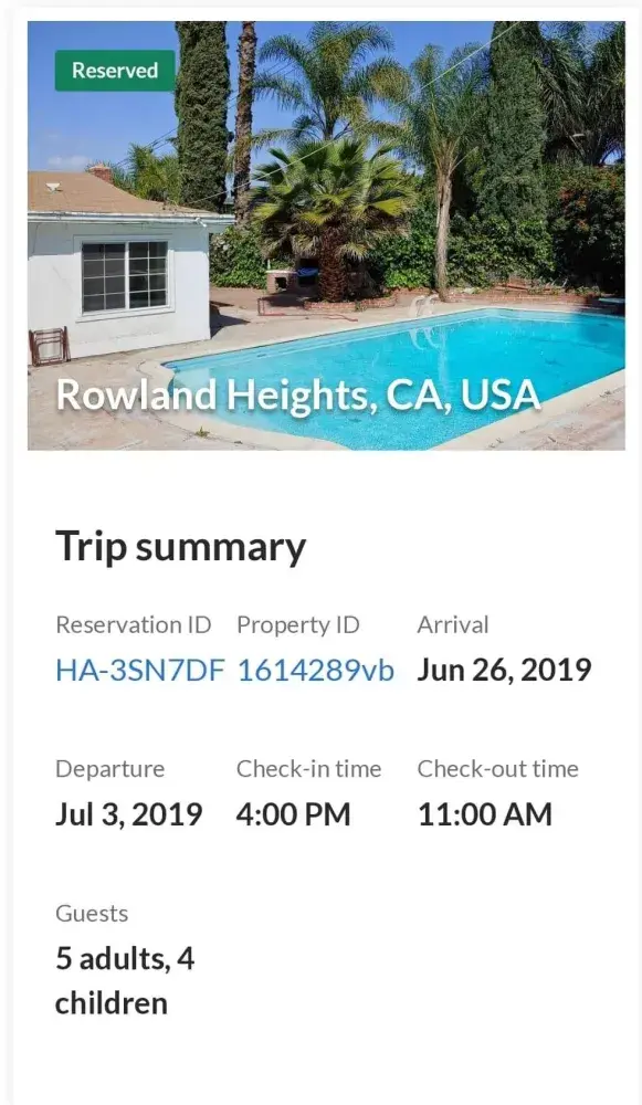 On 20 Apr 19 i rented a home in Rowland heights, CA. Our main reason for renting was the pool from the pictures. We have two families that were going and we wanted to rent a house together. When we arrived on 26 Jun the beautiful pool from the photo was not what we got. The pool had algae all in it and was stagnant water. It doesnt look safe to swim in. Nobody is happy with this rental, and we just want to get out of it right now. I have emailed the owner and we are waiting on his response. We'd just like to get out of it and find a place to accommodate what we wanted to have initially. There's cockroaches in the home and this isn't a well kept property at all.