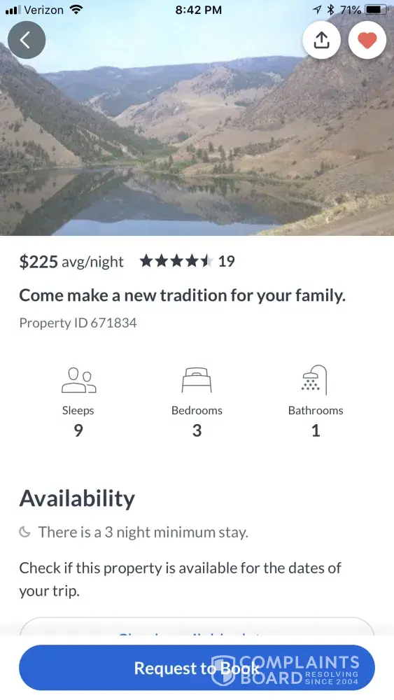 I booked the references property online and my reservation was cancelled with no explanation. I have messaged the property owner multiple times and have been given no information. If you choose to list your property you should have an obligation to at least provide an explanation for cancellation. I am very disappointed. I have used this service for several vacations in the past but will not do so now.