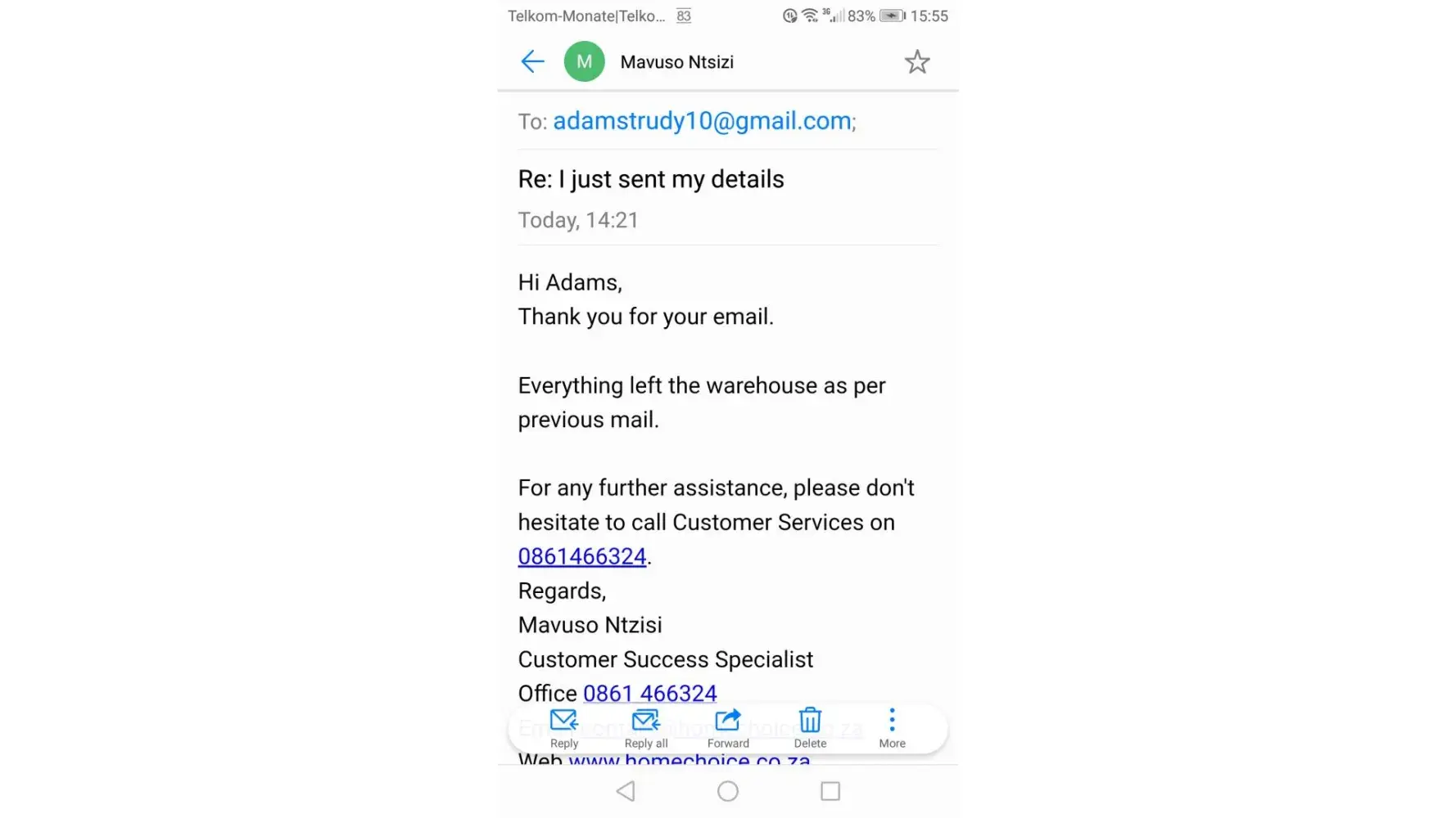 I think homechoice has very very bad customer service.. I'm waiting on my order from the 28th of June and nobody has called me to say where it is.. My mailbox is full of all the emails that I have received the same thing over and over again..
