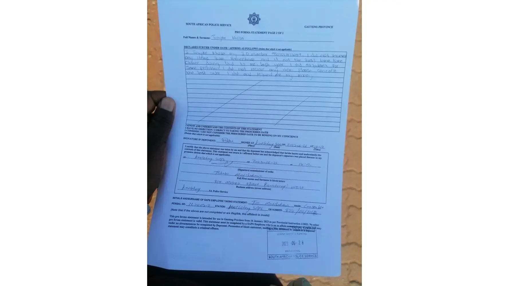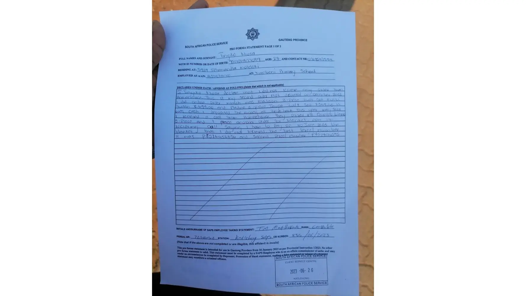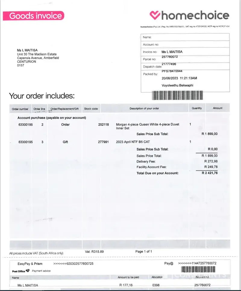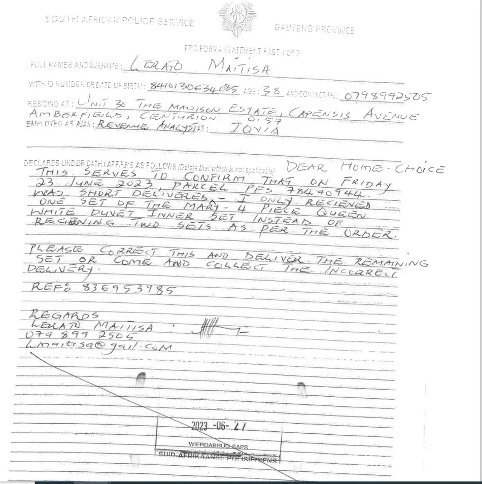 Please note that on the 19th of June 2023 I made an online order for the Mary 4-piece Queen White 4-piece Duvet Inner Set, which was delivered at my house on the 23rd of June 2023. On the 24th of June I realized that the Inner was short delivered and (I only received 2 sets instead of 4 sets as per the order). I immediately contacted the customer service which advised me to do an affidavit confirming that my order was short delivered. I then went and did the affidavit and emailed it to their [protected]@homechoice.c.za email address and when I didn’t receive any follow up from them, I contacted them and was told that they did not receive my email. I spent a lengthy time on the phone call re-emailing the affidavit to the agent (to which she still confirmed no receipt), After a couple of back and forth she advised that I go to the nearest branch and request them to email the affidavit on my behalf (I went to the Pretoria branch on the 8th of July 2023 and was assisted by Fezile who confirmed that she emailed it to their customer service which will be in contact with me. To this day no one has been in contact with me but instead I received a monthly statement which charged me full price even though I did not receive my order in full.