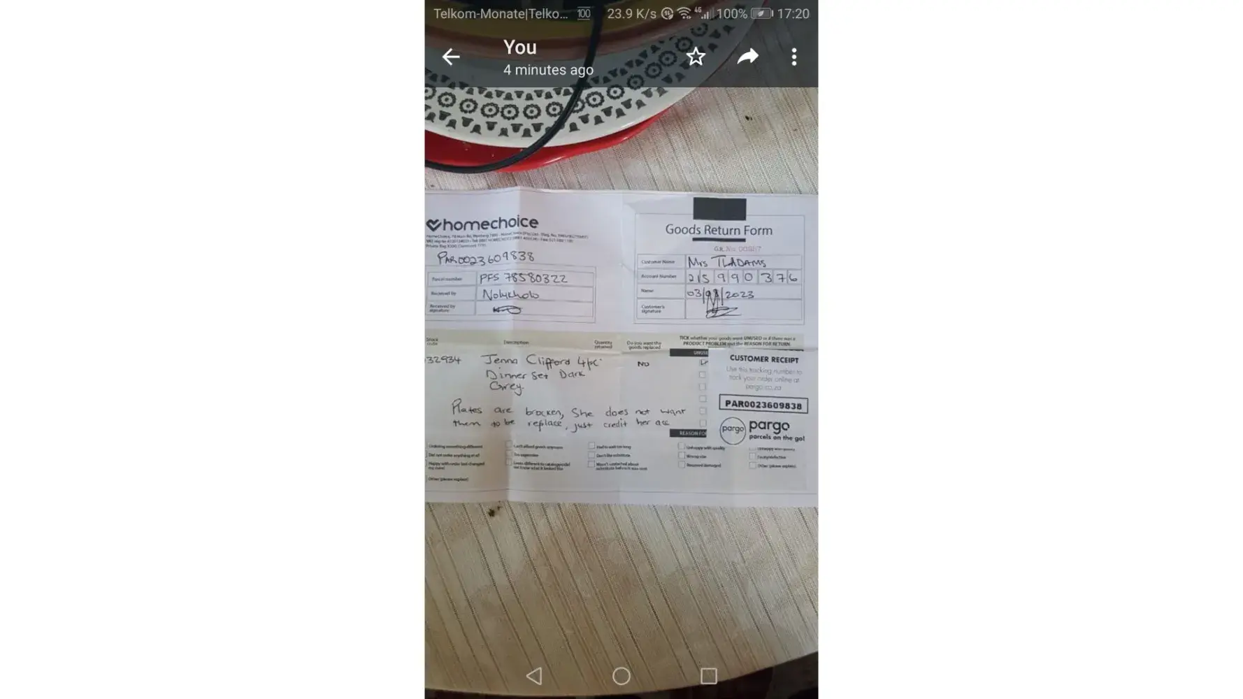I paid my account 370 rand on the 3rd of August now I have no credit i ordered plates the plates came brocken I took it in and told the lady i don't want it and she said that she will credit it on my account... I told her to change my payment to the 10th of every month she did not do anything at all... I find this customer service so so bad i have been waiting for them to contact me for 3 days now... Nobody is taking no notice of me... Why must I pay twice in one month they just messed up my account... I want answer's those plates had to be credited... I'm not paying again the end of August i went into the store to pay... I told her to make the pay day for the 10th of every month but she did not take no notice of me