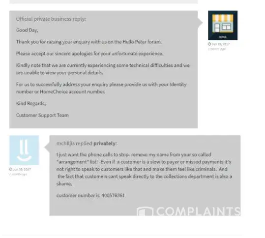 They are quick to call for sales and payments but cannot do their jobs. Little did they know that I also work with accounts and understand and understand how things should work. Common knowledge if you pay your installment the balance should be less if your account is not in arrears. With Home Choice the balance doesn't change which is strange. They reply with