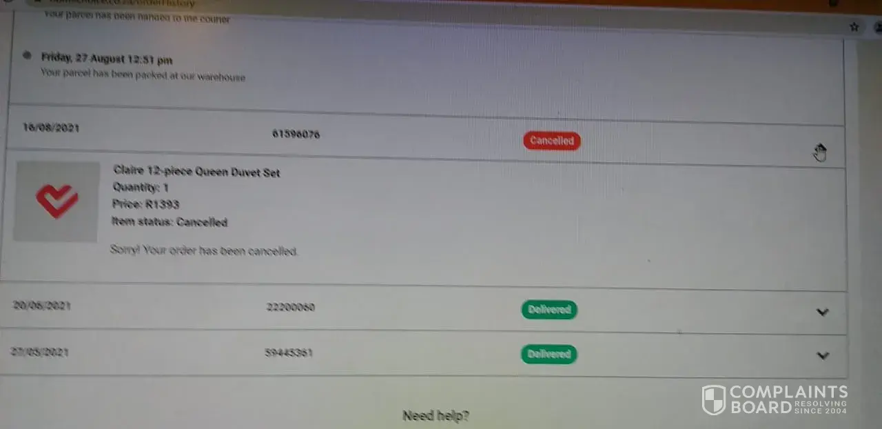 My name is Simon, on the 16 August 21 i place an order of 13 piece Claire bedding set online, it was R1749 and on the 17/08/21 i paid i'm order and send the proof of payment. when i login on the 19/08/21 i find the the processing 12 piece Claire Bedding set with the amount of R1198 and this 12 piece is not on the catalogue, when i check find that 13 piece Claire bedding is in stock and i place an order again of 13 piece Claire bedding set on the 19/08/21, and the processing mystery 12 piece bedding set with the amount of R1249 and i send them email that they must cancel the order again. i called them and they said immediately when the receive the stock they will delivery my order. On the 16/9/21 i saw that 13 piece Claire bedding set is in stock i send an email that the 13 piece is in stock and the told me that the already credit my account i must place an order again while my balance is R0 but i place an order again for the third time and i send an email that they must process my order cause my account is R0. and they send an email that my order is approved, on the 20/08/21 when i check on my side i find that the parked 12 piece again and i send an email again, the called me that the will credit my money cause the don't have 13 piece and the is nothing they can do. and at the first place don't forget that you cant order something if is out of stock. But i ordered 13 piece three times and approved