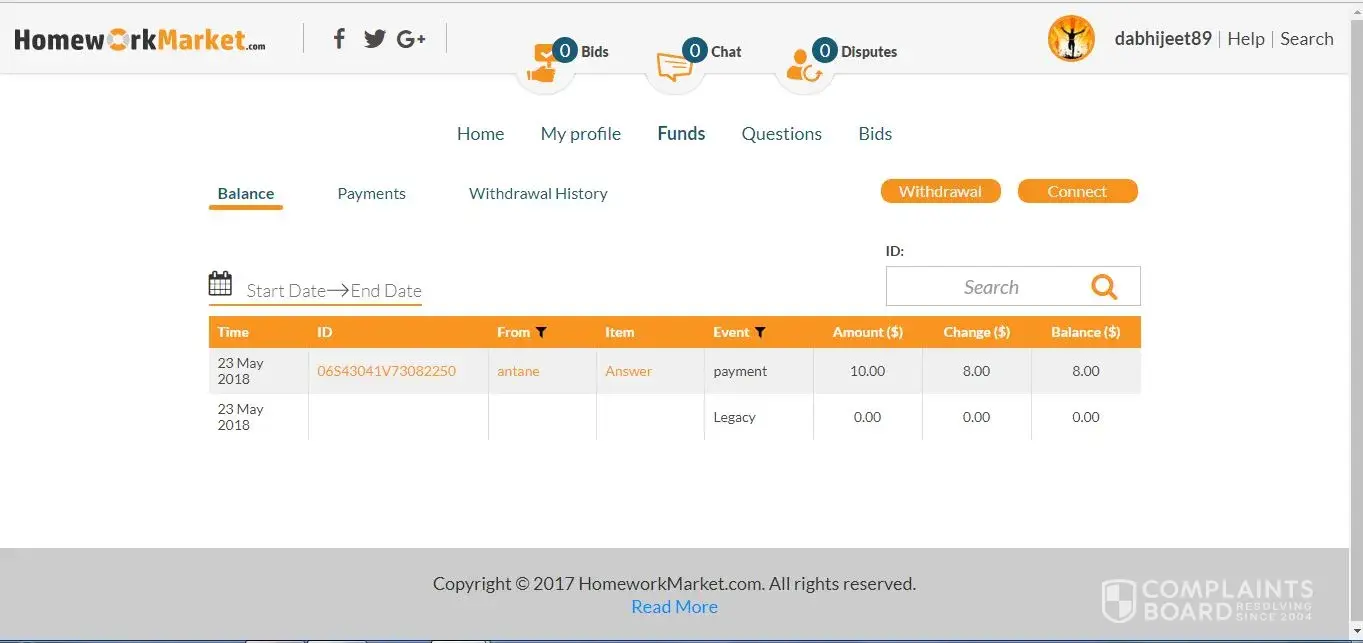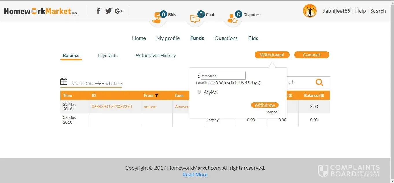 I am tutor in Homeworkmarket "Tutor. Wallace" and recently I got a message on my email that my paypal email had been changed which I was not aware of personally and not the one who had changed the mail. so I followed the instructions as they were indicated by the mail to contact the support. After contacting support they responded quickly and assured me that they have disabled the account as they sort the issue. I was relaxed and greatful for the response from "Jennifer". However since the response date "13th march" I have been contacting the support to respond and enable my account so that I can withdraw my funds but no response. Yesterday I removed the paypal email that had been replaced and returned mine since I wanted to withdraw but still no hopes. So my worry is, why should homeworkmarket victimize me yet I honestly reported the issue which had caught up with me by closing my account and not allowing me to get my hard earned amount?