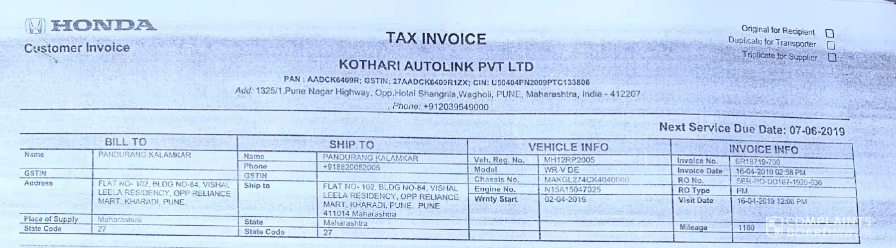 I am Pandurang Kalamkar from Pune, Maharashtra, India (Pin code- 411014). I purchased "Honda WR-V DE Exclusive Edition" car on 30th March 2019 from Viman-nagar Showroom (Opposite to Phoenix Market City, Pune).