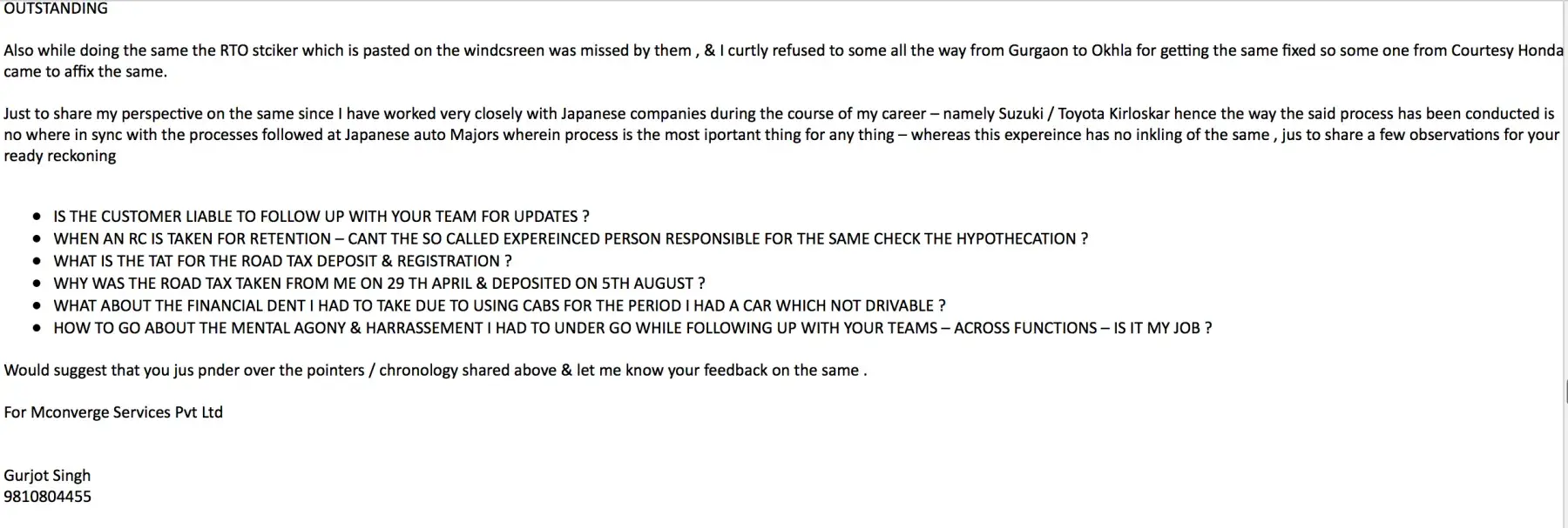 I already raised service request to Honda India but there was irresponsible response from them about my issue. So, I'm writing this complaint to parent company Honda Japan.
