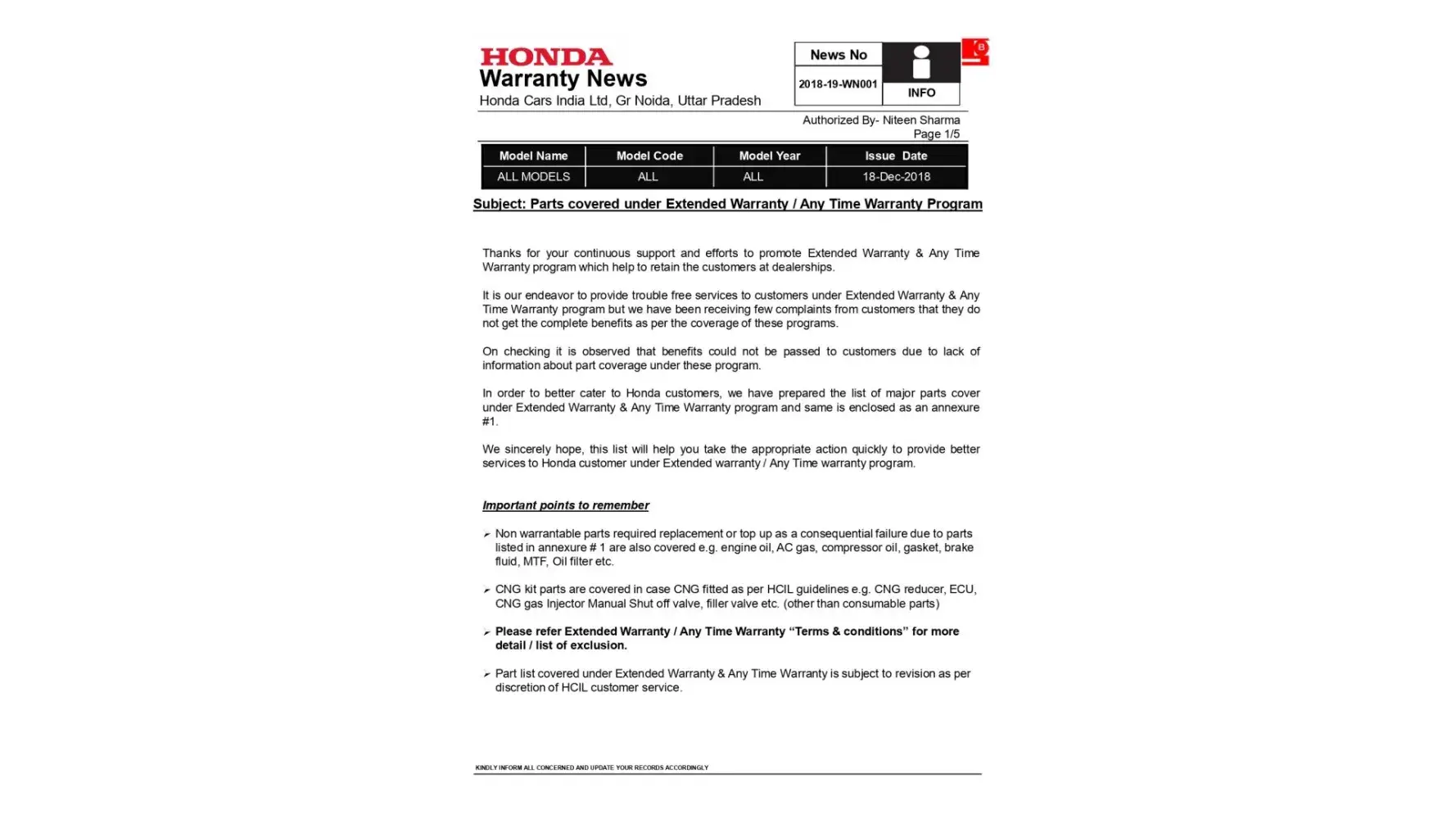 Honda cars not honoring their sold extended warranty of honda city car nor replying the querry in writing