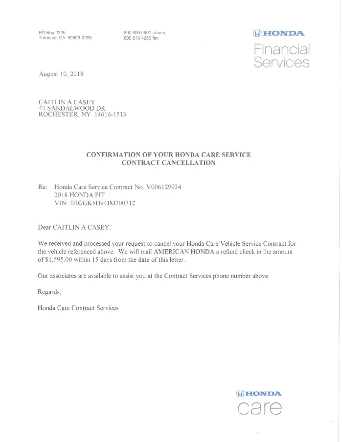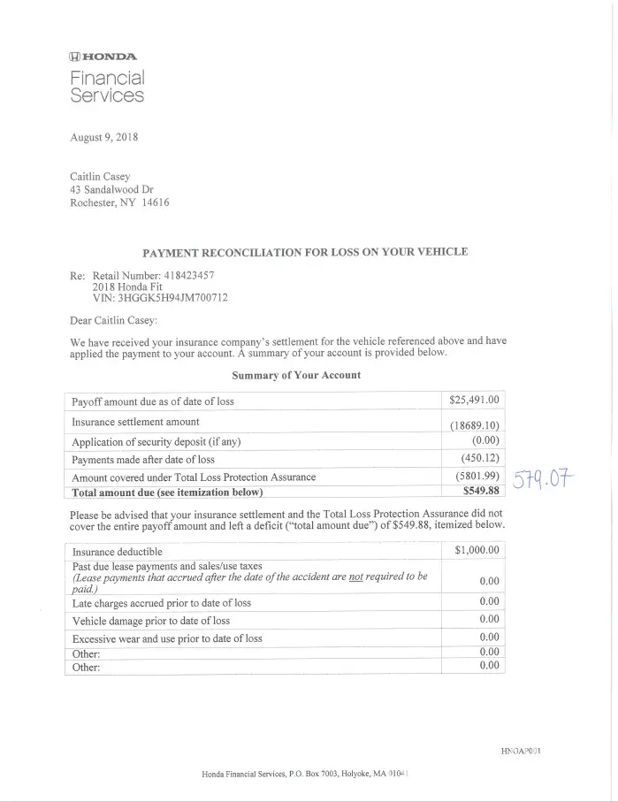 I purchased a new Honda FIT in May 2018. I financed the vehicle through Honda Financial Services. I was in an accident June 23rd, 2018 and the car was totaled. I made my payment the following month (July) but at the beginning on August 2018, I talked to a representative who stated the deductible as well as the outstanding balance would be paid by Honda Care.