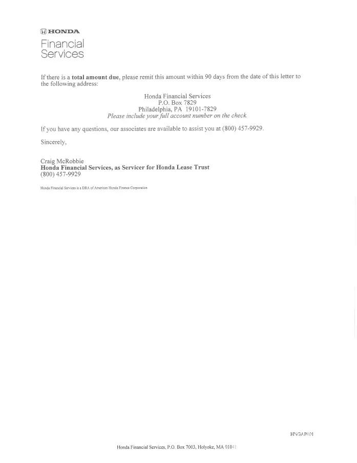 On 3/15/19 I leased a new 2019 Honda Accord that car, having leased a new 2019 Honda Accord Hybrid from Honda of Huntington, New York with a lease from Bethpage Federal Credit Union. My financial obligation to Honda Financial services ended that day since the $380.19 was taken care of through my financial transaction with Honda of Huntington (Tel...